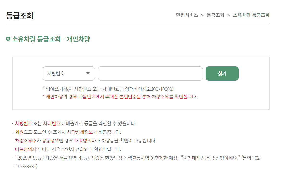 5. 다음으로 차량 소유주 본인인증을 마치면 배출가스 등급을 조회하실 수 있습니다.