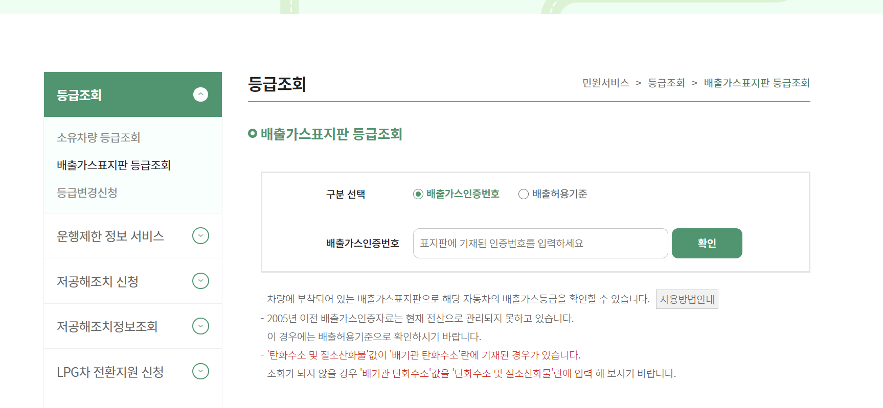 4. 좌측의 등급조회 메뉴에서 [배출가스표지판 등급조회] 메뉴를 클릭합니다. 배출가스 인증번호를 입력하시고 확인 버튼을 클릭합니다. 1번에서 말씀드렸던 배출가스 관련 표지판에서 인증번호를 찾아 적으시면 되며, 영어와 숫자가 혼용되어있으니 참고하시길 바랍니다.