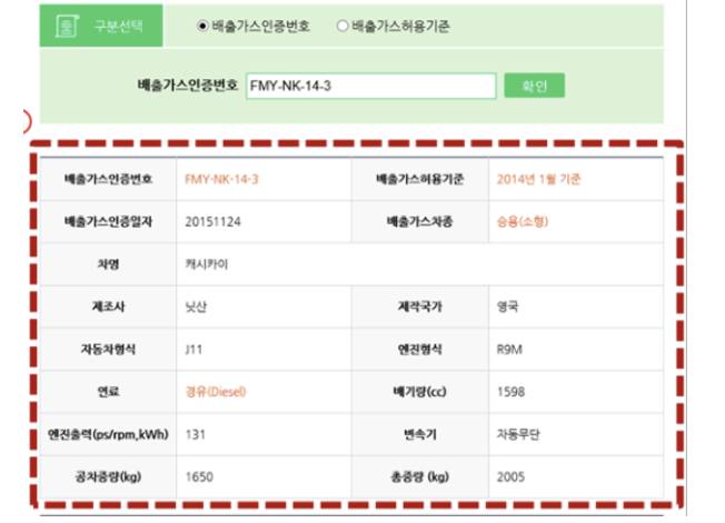 6. 아래 부분의 이 차량이 제작될 때 받은 배출허용기준이 배출가스관련표지판의 허용기준과 일치하는 지 확인합니다. 또한 등급 옆의 물음표를 누르면 배출가스산정표상에서 해당 등급이 산정된 기준정보를 확인할 수 있으니 참고하시길 바랍니다.
