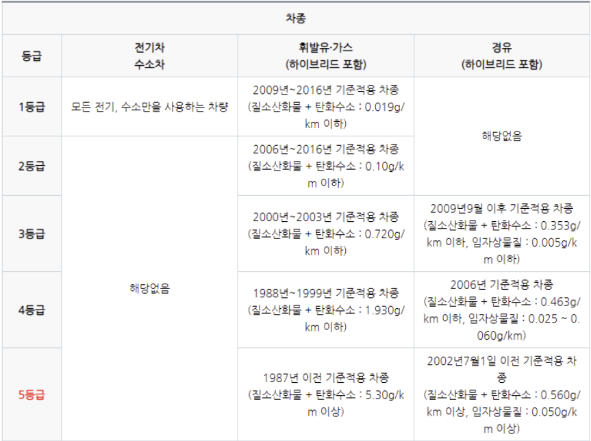 그 외 1등급이나 2등급 차량의 기준, 휘발유차량/가스차량/전기차/수소차의 기준은 아래에 총정리된 자동차 배출가스 등급제를 확인하시길 바랍니다.