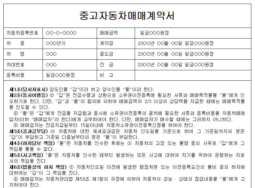 중고차 매매계약서에 대해 궁금해하시는 분들이 많습니다. 이번 글에서는 중고차 매매계약서 작성법, 중고차 계약서 주의사항에 대해 알아보겠습니다. 글 하단에 중고차 매매계약서 양식 hwp, pd