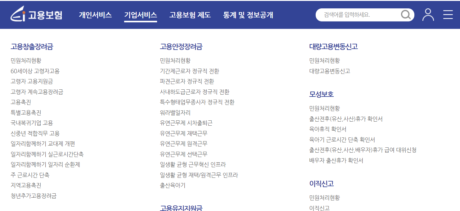 2. [기업서비스] 메뉴 클릭, [고용안정장려금] 메뉴를 클릭합니다.