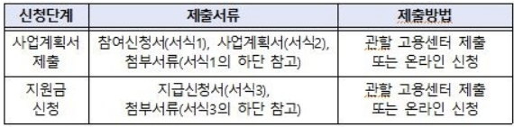 유연근무제 지원금을 신청하려면 사업계획서 제출과 지원금 신청 2가지를 해주셔야 하는데요. 신청단계 별 제출 서류는 다음 표와 같습니다.