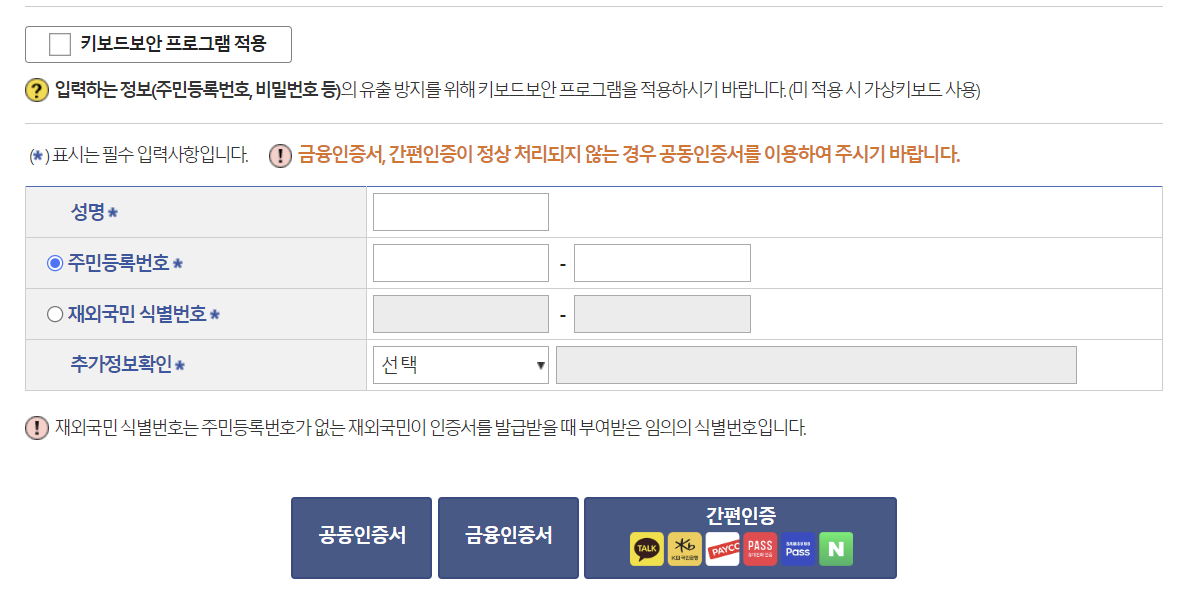 4. 이름과 주민등록번호 그리고 추가정보확인을 입력후 공동인증서로 인증합니다.