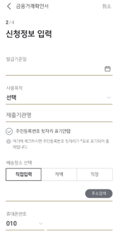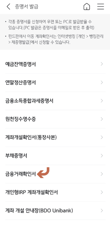 4. 증명서 발급 화면에서 금융거래확인서 메뉴를 터치합니다.