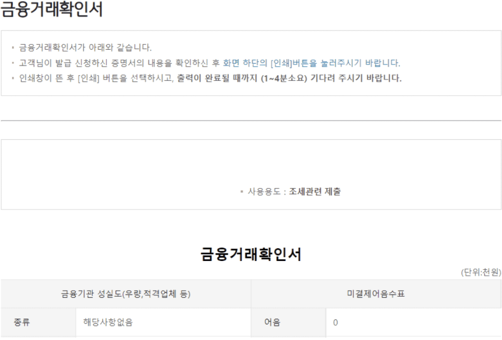 9. 금융거래확인서가 발급되었는데, 하단의 인쇄버튼을 누른 후 출력이 완료될때까지 기다려주시면 됩니다.