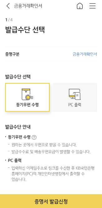 5. 발급 수단에서 우편 또는 PC 출력 중 하나를 선택합니다.