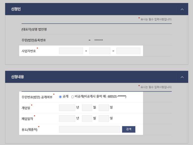 3. 홈택스에서 발급할 때와 마찬가지로 사업자등록번호, 상호, 개업일 및 폐업일, 발급 용도 등을 입력 및 확인해줍니다. 용도(제출처)는 옆의 [검색] 버튼을 눌러서 선택할 수 있습니다.