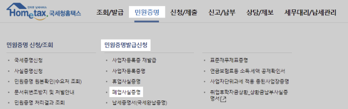 2. [민원증명] - [민원증명발급신청] - [폐업사실증명]을 클릭해줍니다.