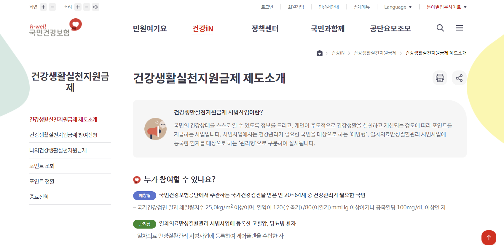 시범지역 내 건강위험요인이 있는 건강보험가입자 중 신청자에 한해서 건강생활신청지원금제 자격이 주어지는데요.