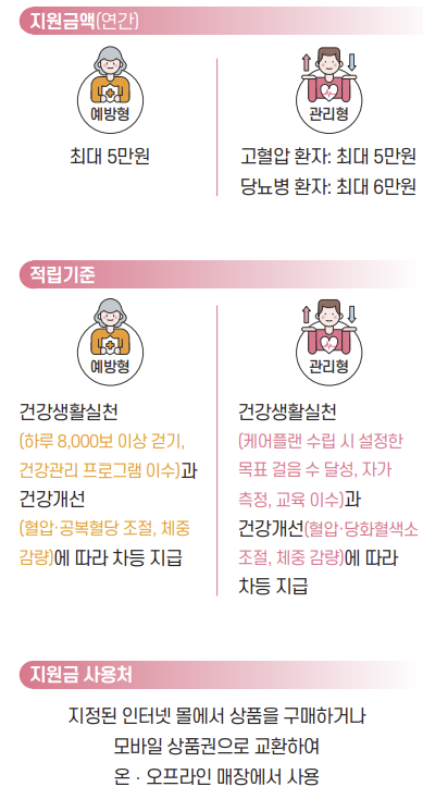 관리형의 경우 고혈압 환자는 최대 5만원, 당뇨병 환자는 최대 6만원까지 지원금이 주어집니다.