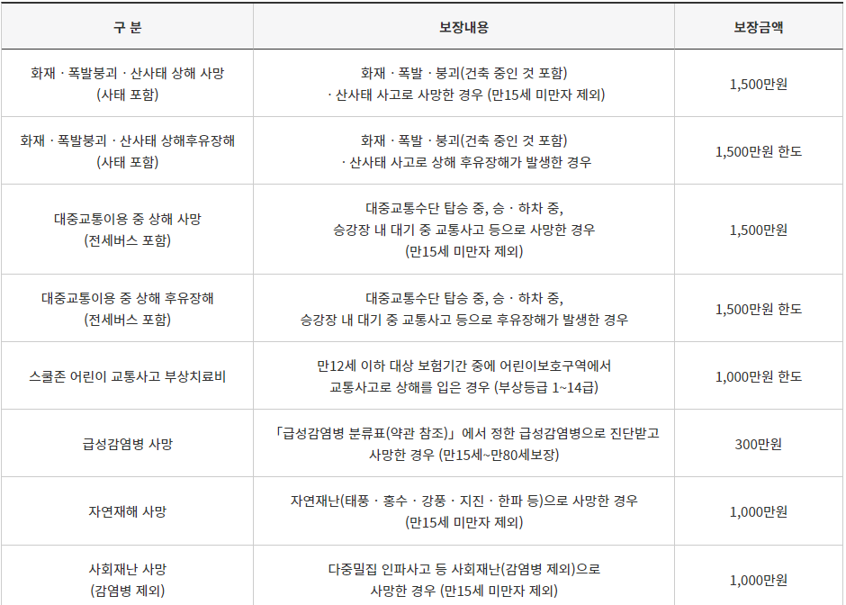 대표적으로 살펴보면 급성감염병 사망의 경우 300만원을 보장하고, 화재 및 폭팔붕괴, 산사태 상해의 경우 1500만원까지 보장을 한다는 사실을 알 수 있습니다.