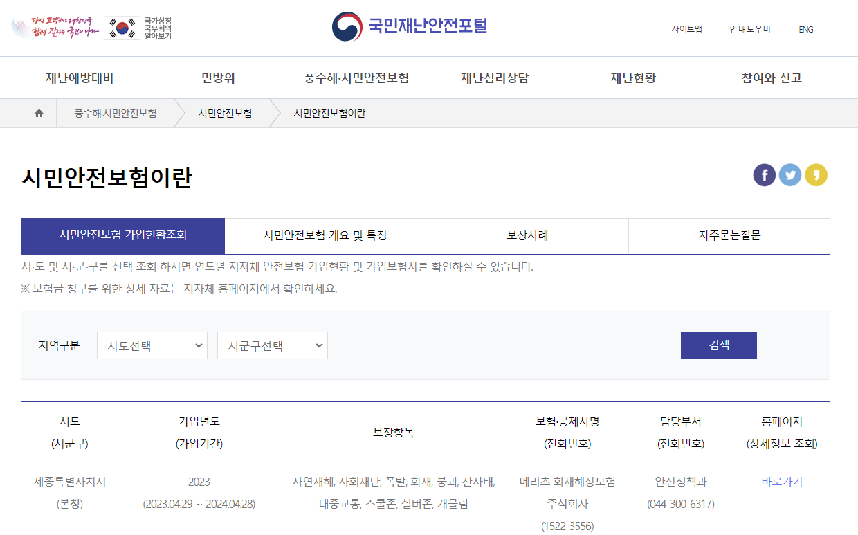 구체적인 시민안전보험 가입 지자체 및 보장 내역 조회는 국민안전재난포탈에서 하실 수 있는데요.