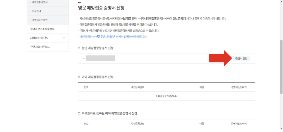 5. 예방접종 관리 > 전자민원 서비스 > 예방접종 증명서 순서대로 클릭합니다.