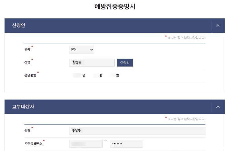 4. 예방접종증명서 신청인 및 교부대상자에 알맞은 내용을 작성해줍니다.