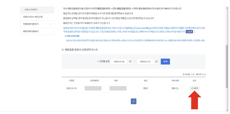 10. 예방접종 증명서 신청내역 화면으로 이동하여 문서 출력 버튼을 클릭합니다.