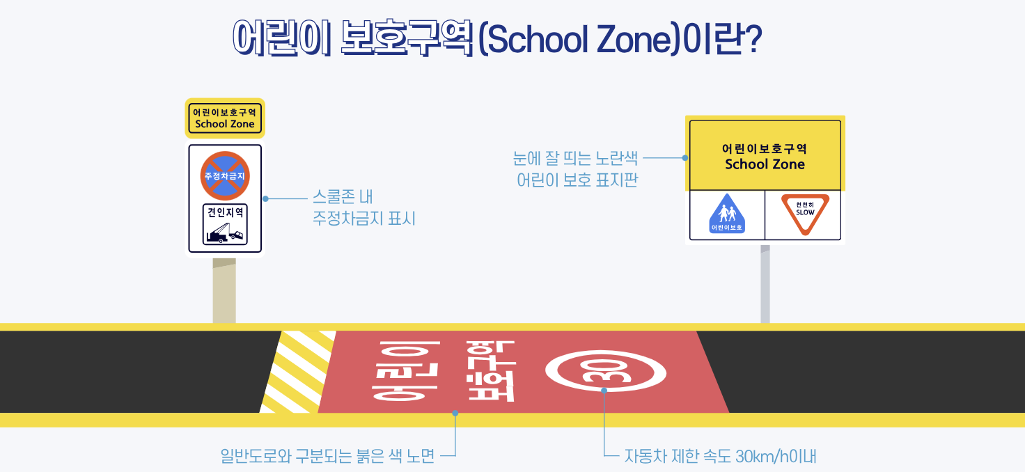 초등학교,유치원,특수학교 및 100인 이상 보육시설, 학원 등 주 출입문을 중심으로 300m 이내의 도로 중 일정구간을 어린이보호구역으로 지정하여 시설 등 개선