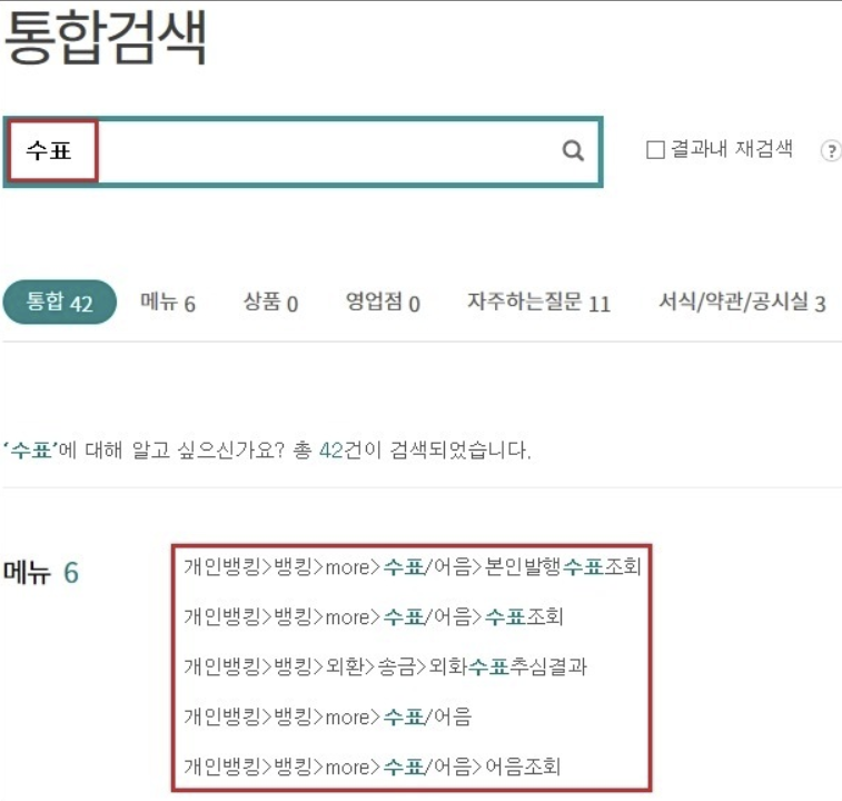3. 수표에 대한 총 검색 결과 중 하나은행 수표조회와 관련된 메뉴를 클릭하여 들어갑니다. 직접 경로를 통하시려면 개인뱅킹, 뱅킹, 수표/어음, 수표조회 순으로 들어가시면 됩니다.