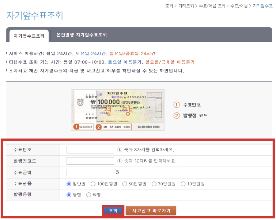 4. 수표번호와 발행점코드를 찾아서 입력 해주시면 되는데 그 외에도 수표에 써있는 금액과 수표권종 그리고 발행은행이 농협인지 혹은 타행인지 확인해 주고 조회를 눌러주시면 바로 조회가 가능합니다.