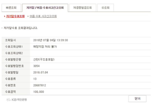 4. 아래와 같은 세부내용을 적은 뒤 조회 버튼을 눌러주시면 됩니다. 그러면 아래와 같이 해당 수표에 대한 결과를 확인할 수 있습니다.