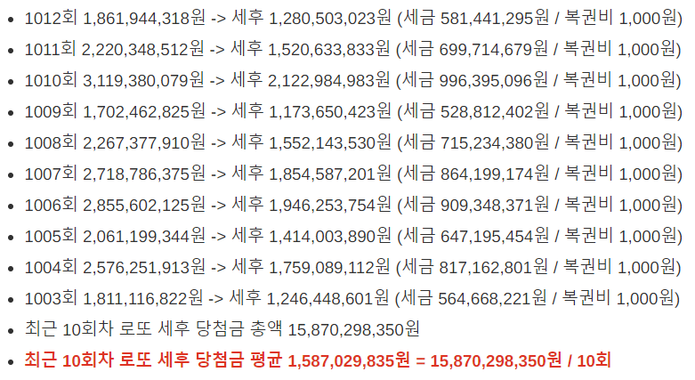 로또 1003회 ~ 1012회 1등 평균 실수령액