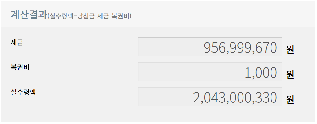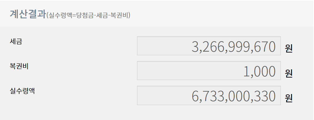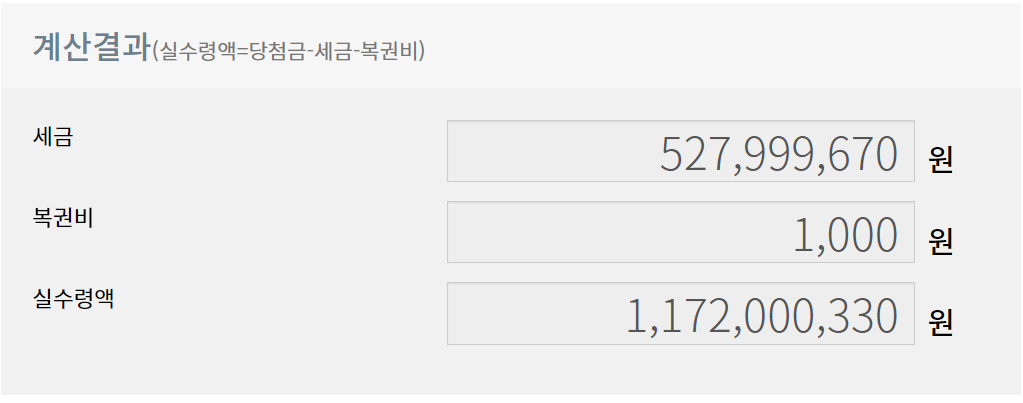 로또 당첨금은 소득세법상 기타소득에 해당하며 ‘기타소득’은 3억원 초과 시 33%의 세율을 부과하고 있습니다. 세금으로만 642,205,853원 (약 6억 4천만원)을 떼가는 셈입니다.
