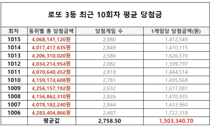 각 회 차 별로 3등 당첨금에 차이가 있어 최근 10회차 로또 당첨결과를 기준으로 평균 값을 계산해보았습니다. 그 결과 매 회 차마다 평균 2,758.50개의 로또 3등 당첨복권이 나왔으며, 평균 당첨금은 세전 약 150만원입니다.