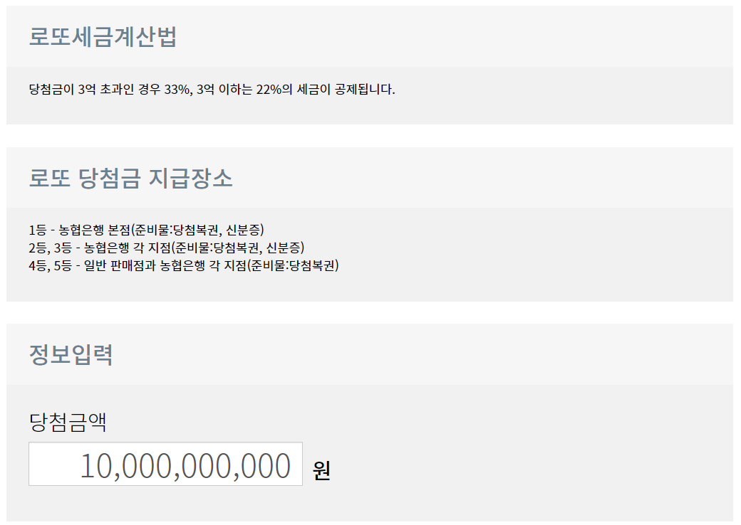 로또 실수령액과 세금에 대해 알려드렸지만, 실제 본인의 당첨금액에 따라 실수령액과 세금이 얼마나 나오는지 계산하기 어려워하는 분들이 있는데요. 그런 분들을 위해 로또 실수령액 계산기와 로또 세금 계산기를 준비해봤습니다.