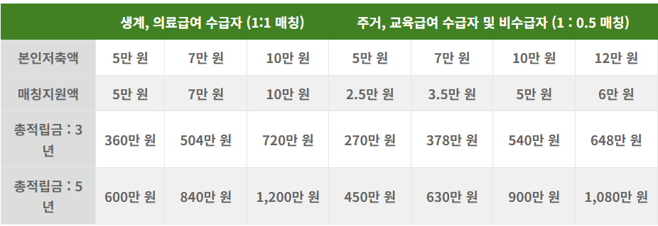 참여자가 매월 일정 금액을 3년 또는 5년간 저축하면 소득 수준에 따라 본인 저축액과 동일한 금액 또는 1/2 금액을 서울시와 민간후원금으로 적립 및 지원합니다.