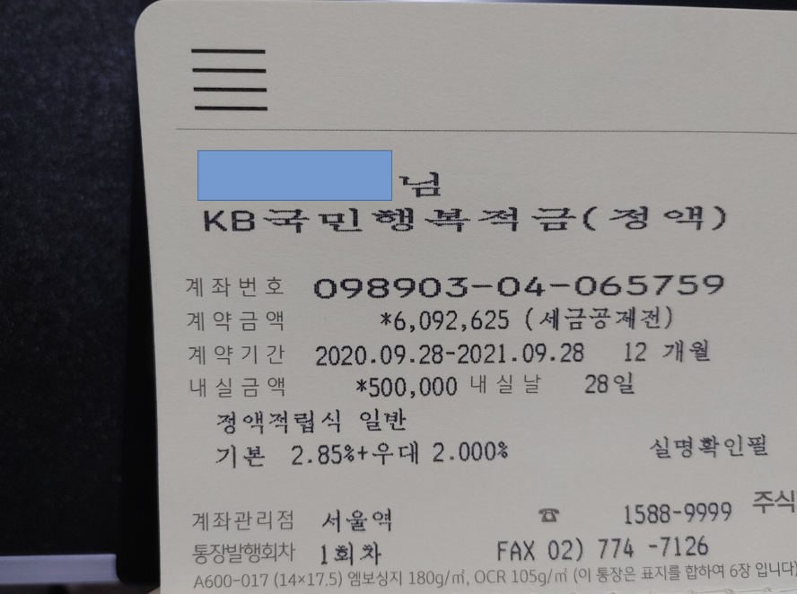 두둥! 어느덧 1년이 지나 KB 국민행복적금 만기일이 되었다. KB 국민행복적금은 기초생활수급자, 북한이탈주민, 결혼이민여성, 근로장려금 수급자, 한부모가족지원 대상자들에게 시중 금리보다 높은 금리를 제공하는 적금 통장이다. 나는 작년에 근로장려금 수급자여서 이 적금에 가입할 수 있었다.