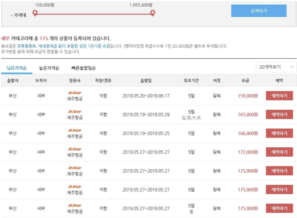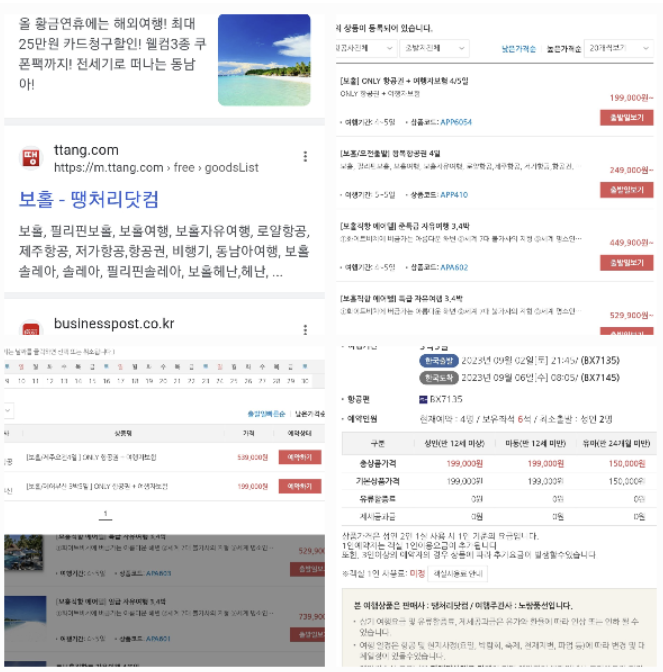 아래 사진의 오른쪽 상단을 보시면 보홀 only 항공권+여행자보험이 보이시지요? 저는 3박5일 일정이었고요, 199,000원에 왕복항공권을 구입했습니다.