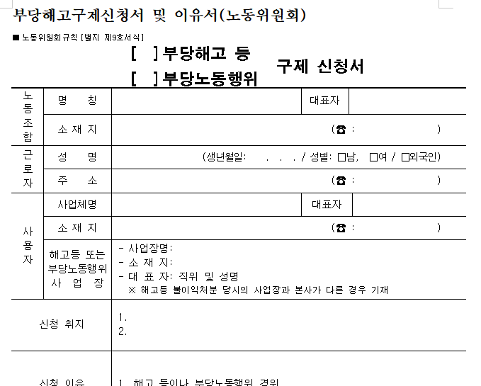 부당해고 구제신청시 사용하실 수 있도록 부당해고 구제신청서 양식을 첨부해두었습니다. 하단 링크를 클릭하시면 부당해고 구제신청서 양식 다운로드가 가능합니다.