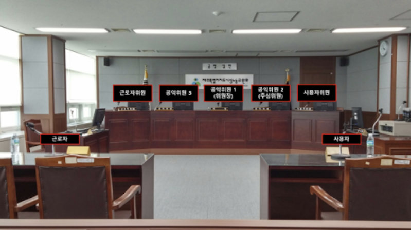 보시는 바와 같이 무작위로 선발된 공익위원 3분이 가운데 앉으시고 제일 가운데도 의장님의 자리입니다. 그리고 근로자측 의견을 들어주는 근로자위원과 사용자 측 의견을 대변해주는 사용자 위원이 앉아 총 5분입니다.