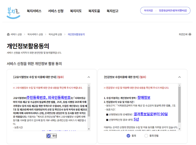 6. 사회 복지 서비스 및 급여 신청에 대한 유의사항을 확인합니다.