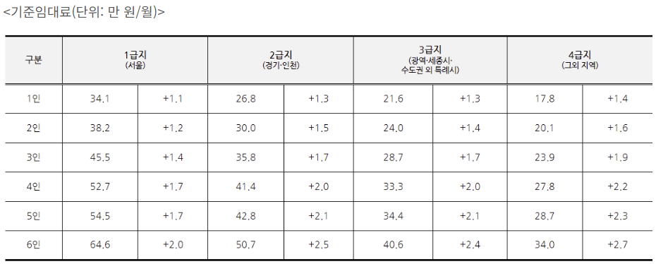임대료 선정기준은 지역에 따라 다르게 적용되고, 월세가 기준 임대료 조건을 넘으면 기준 임대료까지 지원을 받으실 수 있습니다. 2024년 임대료 지원은 작년과 비교하여 최대 2만 7천 원이 인상되었으니 참고하시길 바랍니다.