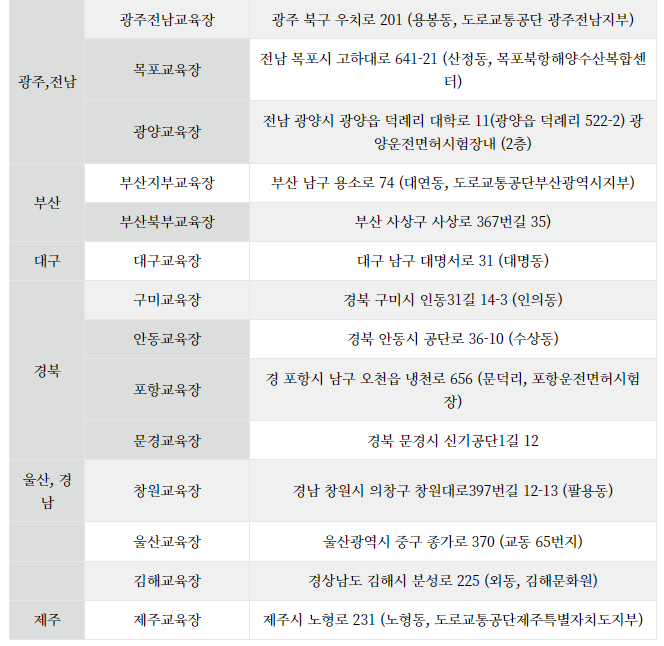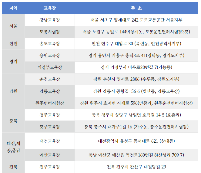 특별교통안전교육 장소에 대해 알아보겠습니다. 전국에 총 28개의 교육장이 있는데요. 각 교육장의 상세 주소는 아래 사진을 참고하시길 바랍니다.