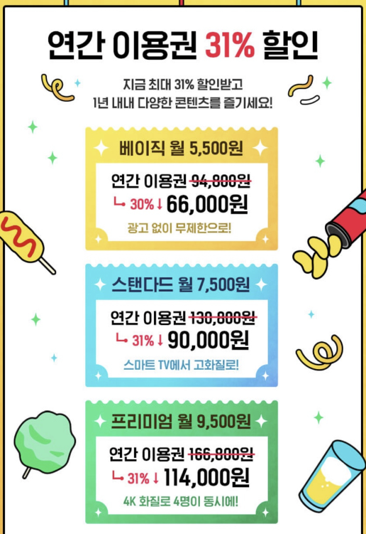 2023 티빙 페스타의 경우 티빙 연간 할인은 베이직은 30%, 스탠다드와 프리미엄은 31%의 할인 혜택을 받을 수 있는데요.