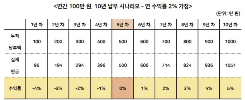연 수익률 2%, 납입금액을 100만원으로 가정하여 연금보험의 실질 수익률을 알아보면, 5년이 지나서야 비로소 내 보험자산이 실제 납입한 금액과 같아집니다.