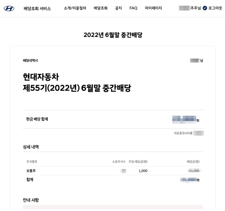 현대차는 2021년 기말배당부터 우편 배당통지서 대신 온라인 배당조회 서비스를 제공하고 있는데요. 현대차 주주라면 현대차 홈페이지 배당조회 서비스에서 배당금을 조회하실 수 있습니다.