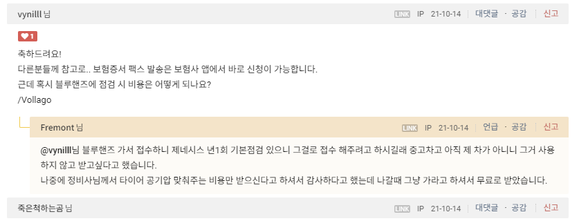 차를 받자마자 점검 접수하고 블루핸즈에 사정을 설명합니다. 중고차를 샀고 성능지를 받았는데 확인하고 싶다고 했습니다.