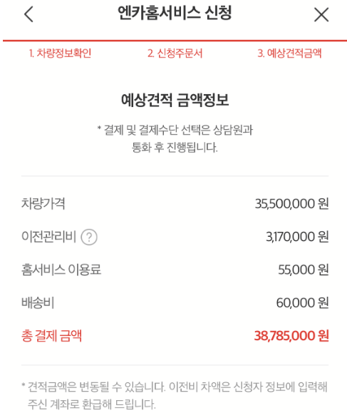 3월 17일 홈서비스매니저에게 구매확정의사를 전달하니 차량이전비 잔금과 엔카보증보험 비용을 입금하면 구매진행을 도와준댄다.
