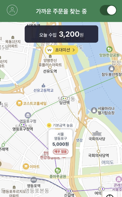 그리고 가끔 바쁜 시간대에는 '미션'이 걸려서 추가로 배달 수수료를 받을 수 있다.