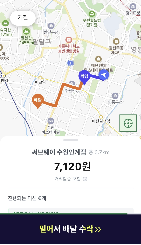 거리와 배달지를 확인했다면 밀어서 배달을 수락하면 된다.