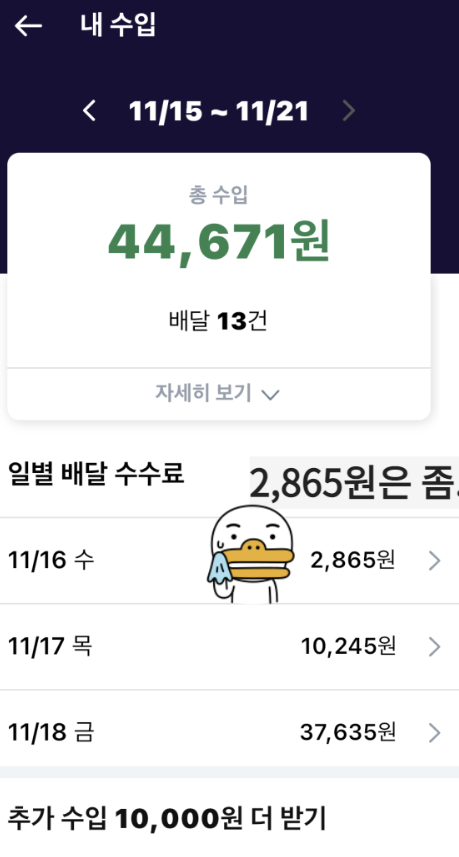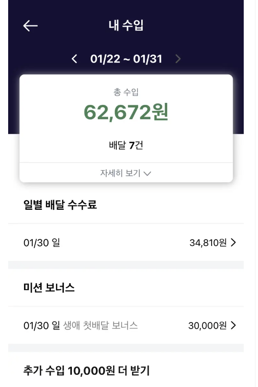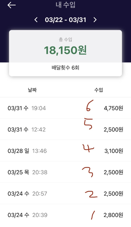 (오토바이로 주에 200씩 찍는 사람들은 진짜 몸 갈아서 하는 것 같네요. 제가 무직이라면 일에 10만 찍을때까지 하겠는데 투잡으로는 2시간이상은 무리라고 판단)