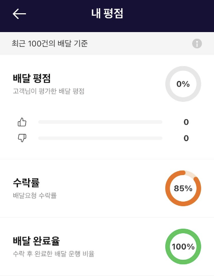 쿠팡이츠에만 있는 건데요.. 고객이 평가한 배달평점과 배달요청 수락률, 배달 완료율 등으로 제 평점이 정해집니다.