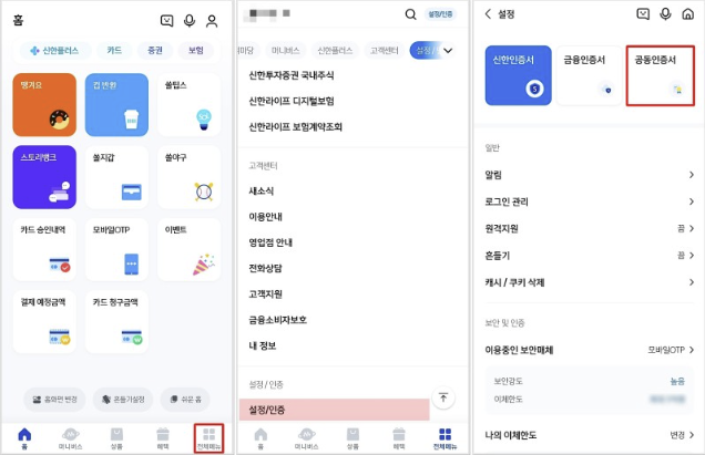 5. SOL앱 우측 하단의 전체 메뉴 > 설정/인증 > 공동인증서 메뉴 순서대로 접속합니다.