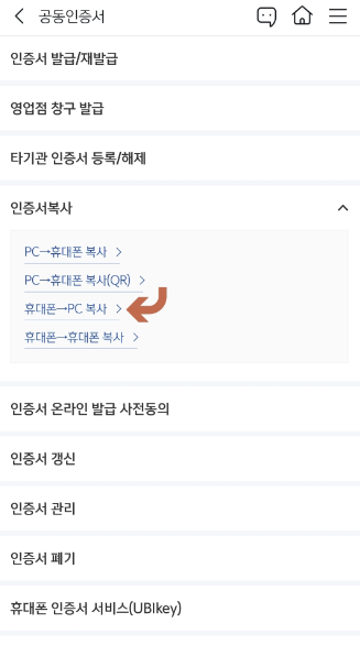 2. 상단 메뉴 <공동인증서 → 스마트폰 인증서 복사>에서 <PC → 스마트폰(앱) 복사> 메뉴 순서대로 클릭합니다.