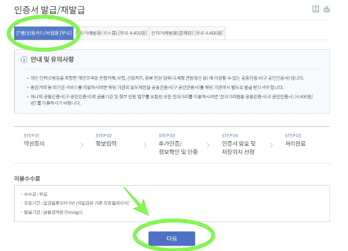3. 은행/신용카드/보험용 [무료] 인증서 메뉴를 선택한 후 하단의 다음 버튼을 클릭합니다.