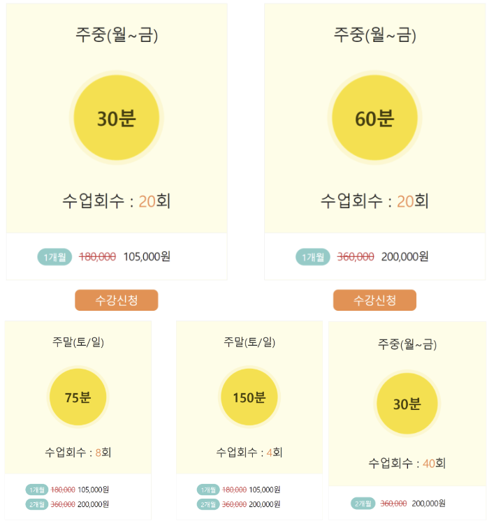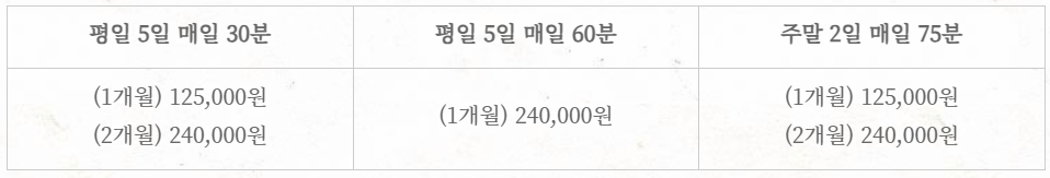 일단 가장 눈에 들어온건 아무래도 수강료이다. 수강료는 주중 월~금 30분 기준 20회에 105,000원이다.