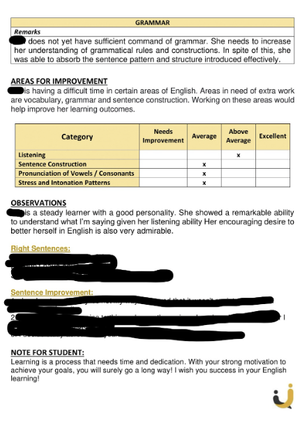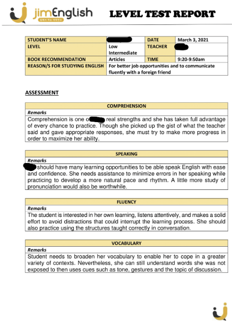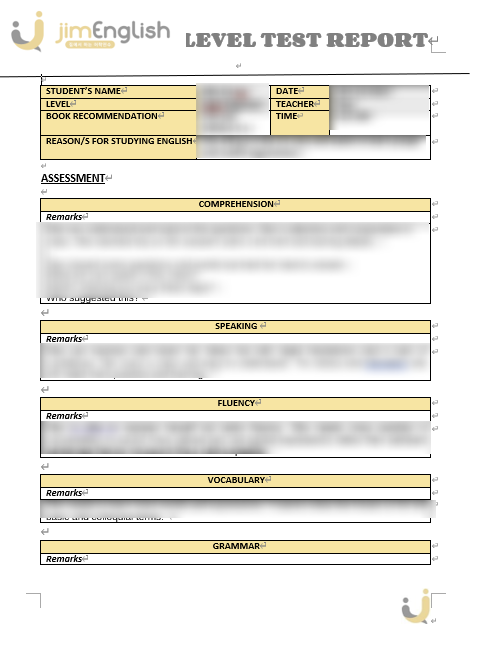 실제 레벨테스트 결과지는 다음과 같으니 참고하시길 바랍니다.
